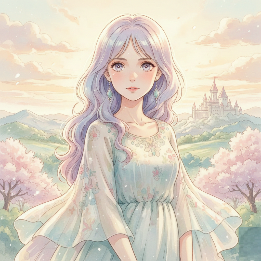 Create a beautiful anime girl portrait from my uploaded photo in a soft, dreamy Studio Ghibli-inspired style. The character has large, luminous expressive eyes with detailed iris highlights and warm, sparkling reflections that convey gentle emotion. Soft pastel colors — blush pink, lavender, sky blue, and warm cream — create a serene, fairytale atmosphere. The hair flows in delicate, animated strands with subtle wind movement. Cinematic lighting wraps softly around the face with warm golden-hour tones, and the background features soft bokeh with floating particles of light. Ultra-detailed cel-shading with smooth gradients produces a polished, professional anime portrait.